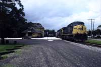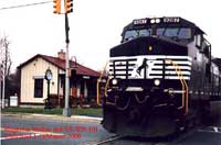A traffic light is being installed in November 2003, and this might delay your train chase, it may not allow any traffic while the train is crossing. The next two traffic lights turn all-red while a train is here, so you will lose time at both intersections. Magnolia station is next, with a park on the grounds. This is the last depressing traffic light you have to deal with. The photograph at left is at Magnolia station. Photograph: Mike DiMunno.