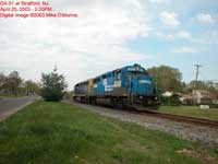 Trains start out on the Beesley’s Secondary at CP-BROWN in South Camden. This location isn’t a great place to be alone. You can get shots and get out, but try not to make yourselves stand-out as railfans. Therefore, you’d be better off making your first shot at Collingswood or Oaklyn, along Atlantic Avenue. The photo at left is at Oaklyn. Photograph: Mike DiMunno
