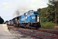 The sequence of roads is Bairdmore, 15th , 2nd and then 14th, leading to a model railroad shop, and a photo stop. From Bairdmore to Folsom is RIGHT, curve left and then a RIGHT turn. Keep chasing and turn right onto Route 54 South. You can head in Jackson Road for a photo at the Newtonville Post Office, but you’ll have to come back to Route 54. At the end of Route 54, turn left and then a quick right onto Tuckahoe Road (557) and leans to Milmay siding, and 7-mile straightaway. This is self-explanatory. Tuckahoe Road is very fast and you can take 6 or 7 series of shots in this 7-mile distance. The photograph at left is of a coal train parked on Milmay siding. This happens relatively frequently when the plant is full. Photograph: Tom Duke.