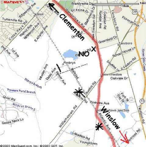 The fun really starts in Clementon, when you’ll have to leave the tracks and take other roads. The trick is NOT to turn right, but STRAIGHT into a one-way street,, and then a LEFT past Clementon Amusement Park. You’ll know this road when you see a shopping center at a T-intersection. At the first traffic light past the park, turn RIGHT onto Watsontown-New Freedom Road. It’s a graudual right at this traffic light. Continue on this road, skipping Cross-Keys Road, until coming to a Produce stand and a stop sign. Turn RIGHT here. Pembryn Road leads to a crossing, but is not a shooting location, and is a dead-end. Continue following the railroad and turning a gradual RIGHT again, at a garden center. Staying on this road (536) will lead to Johns Manville company and a PRSL freight dock.