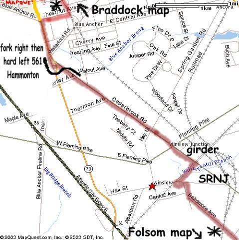 After this location, go back to Route 73 and find a LEFT jughandle LEFT turn onto 561 toward Hammonton. This is the road that passes Winslow Junction of the SRNJ. You can wait here for the train to cross the girder bridge above SRNJ or turn right and head toward Bairdmore Ave. where the interchange track is. You'll need to take Bairdmore Ave anyway to get to Folsom. The photograph at left is at Bairdmore Avenue. Photograph: Tom Duke.